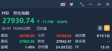 智通财经APP获悉,恒指早盘小幅低开后快速走低,午后跌幅收窄,于平盘线附近震荡。截至收盘,恒生指数跌11.73点或0.04%,报27930.74点,全日成交额达910.12亿。国企指数涨0.26%,报11063.94点,红筹指数涨0.42%,报4405.3点。