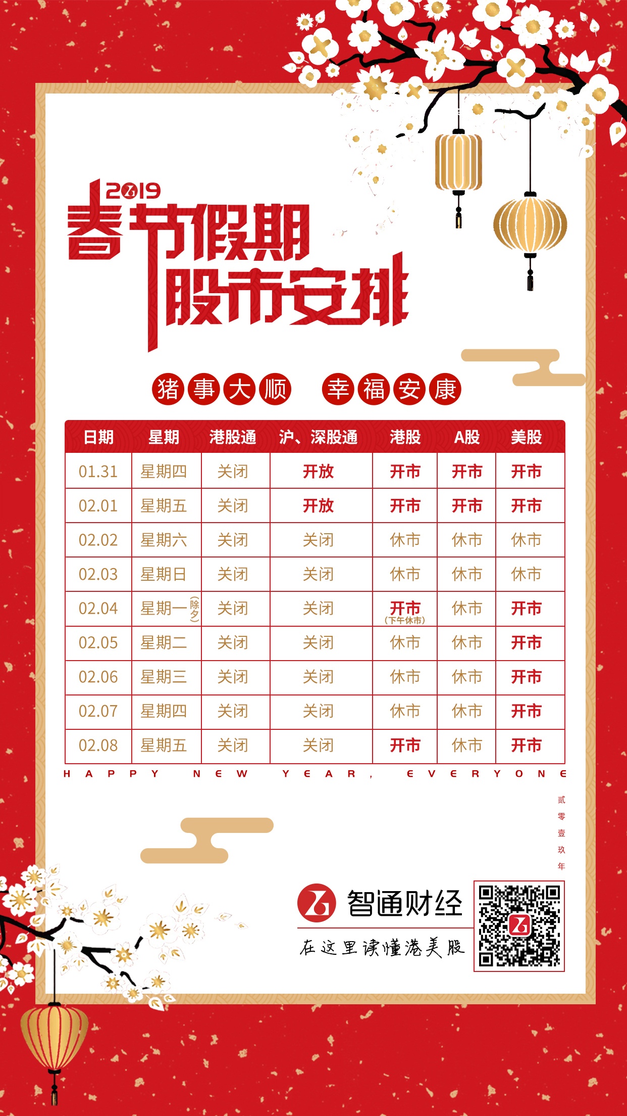 智通财经APP获悉,春节假期即将来临,香港股市方面,2月4日(除夕)上午开市,下午休市;2月5日(大年初一)至7日(大年初三)香港全天休市,2月8日(大年初四)正常开市。