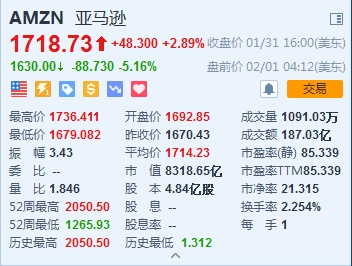 1月31日美股收盘后亚马逊公布了2018年第四季度的财报,总体超出市场预期,但对2019年第一季度的营收预测略低于预期。财报显示,亚马逊第四季度EPS 6.04美元,预期5.56美元。四季度净销售724亿美元,预期719亿美元。预计第一季度净销售额为560-600亿美元,预期609.9亿美元。