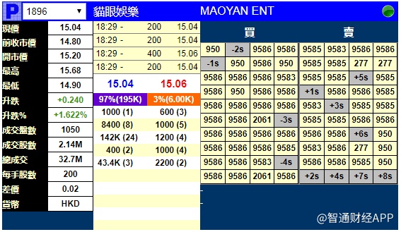 智通财经APP获悉,猫眼娱乐(01896)将于2月4日在港交所挂牌,上市前夕,据辉立交易场资料显示,暗盘收报15.04港元,较招股价14.80港元,涨1.622%。每手200股,不计手续费,每手赚48港元。
