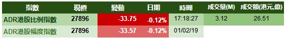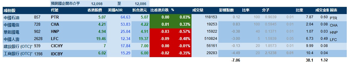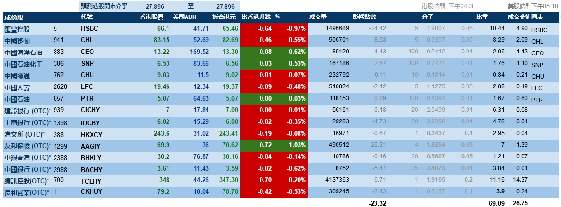 智通财经APP获悉,隔夜港股ADR指数全日偏软,按比例计算,收报27896点,跌33.75点或0.12%。大型蓝筹全线向下,汇丰控股报65.46元,较港收市跌0.64元;腾讯控股收报347.3元,较港收市跌0.7元。友邦逆市走强,收报70.62元,较港收市升0.72元。