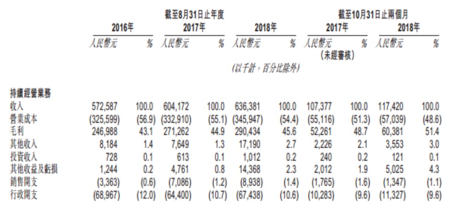 于往绩记录期间,中汇集团收入从截至2016年8月31日止年度的5.726亿元增至截至2017年8月31日止年度的6.042亿元,并进一步增至截至2018年8月31日止年度的6.364亿元。其持续经营业务所得年内利润在截至2018年8月31日止年度为1.772亿元。