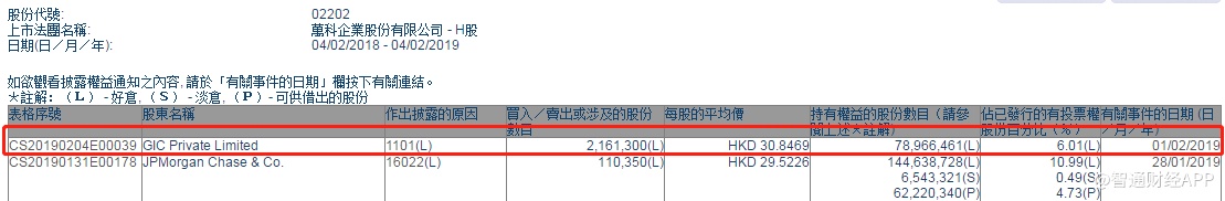 智通财经APP获悉,香港联交所股权变动资料显示,GIC Private Ltd于2月1日增持万科企业(02202)216万股,每股作价30.8469港元,总值约6662.93万港元,最新持股数目约7896万股,最新持股比例增至6.01%。