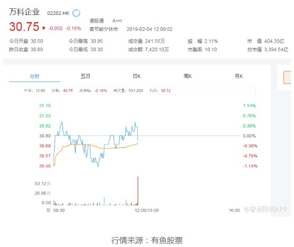 截至今日收盘,万科企业(02202)收跌0.16%,报30.75港元。