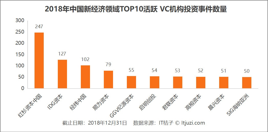 智通财经APP从IT桔子获悉,在“资本寒冬”言论甚嚣尘上的2018年,从新经济领域投资事件数量来看,红杉中国以247起领跑中国,IDG资本以127起紧随其后。