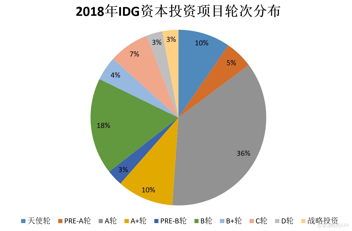 据智通财经APP统计,2018年IDG资本在B轮融资以前的股权投资项目占比高达64%。其中天使轮、PRE-A轮、A轮、A+轮、PRE-B轮分别参与了13起、7起、49起、14起、4起项目,于总投资项目中占比分别为10%、5%、36%、10%、3%。