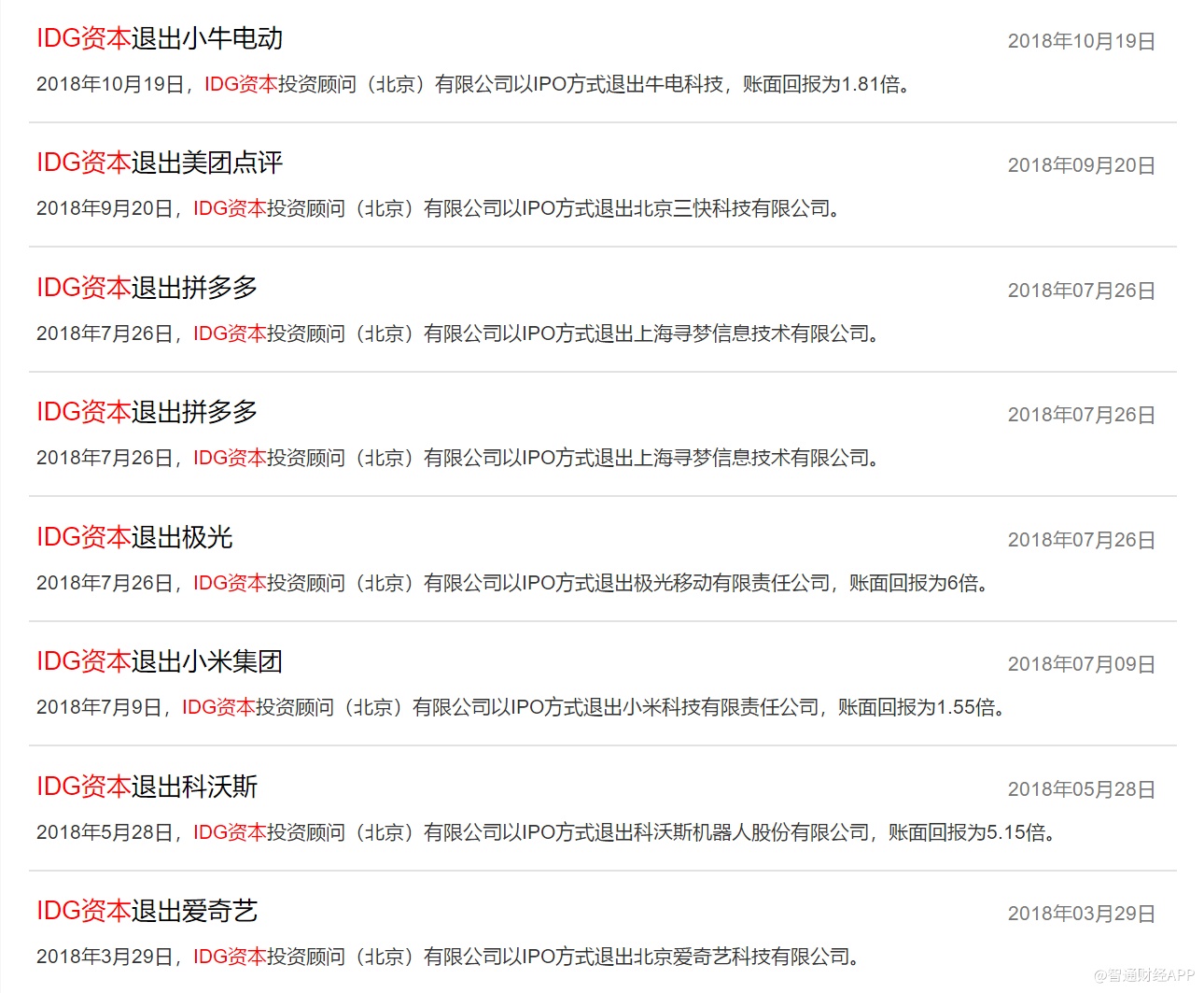 除了小米、蔚来汽车,IDG资本在2018年通过IPO退出的企业还有小牛电动、美团点评、拼多多、极光、科沃斯以及爱奇艺。