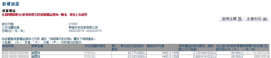 智通财经APP获悉,香港联交所股权变动资料显示,郁国祥于1月30日及2月1日合共增持乐游科技控股(01089)6610万股,每股作价2.15港元,总值约1.42亿港元,最新持股数目21.32亿股,最新持股比例增至69.9%。