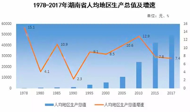 回顾湖南省近40年来的发展成果,全省地区生产总值由1978年的146.99亿元,增加到2017年的33902.96亿元。湖南人均地区生产总值由1978年的286元,增加到2017年的49558元。