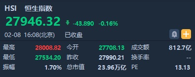 智通财经APP获悉,恒指早盘大幅低开后震荡走升,跌幅不断收窄。截至收盘,恒生指数跌43.89点或0.16%,报27946.32点,全日成交额达812.75亿。国企指数跌0.72%,报10956.58点,红筹指数跌0.89%,报4370.56点。港股通今日关闭。