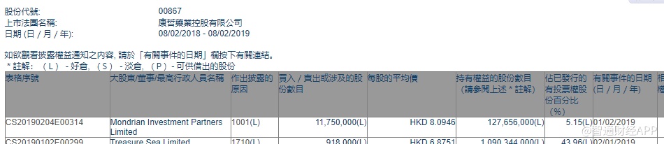 Ltd于2月1日增持康哲药业(00867)1175万股,每股作价8.0946港元,总值9511.15万港元,最新持股数增至1.27亿股,最新持股比例增至5.15%。