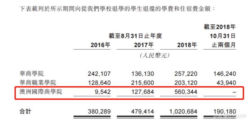 招股书显示,2016-2018年,学生退还学费及住宿费从38.0万元增至102.1万元。其中增长最大的便是公司在澳洲的国际商学院,三年复合增长率为666.3%,虽然退学金金额对公司整体业绩发展不构成重大影响,但却从侧面反映出澳洲国际商学院在办学及市场推广过程中或存在一定曲折。