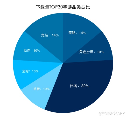 智通财经APP整理发现,据App Annie数据,上榜2018年下载量Top30的手游类型分布较为均衡,除了休闲类手游仍占大头,其余手游品类占比均在10%-14%之间。
