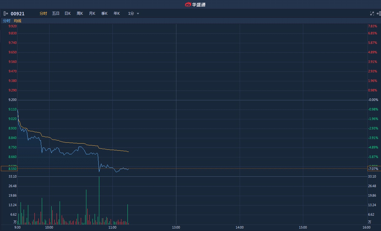 智通财经APP获悉,海信家电(00921)此前连续三个交易日上涨,累计涨幅达14.29%,今日现大幅回调。截至11时14分,跌7.07%,报价8.55港元,成交额3843万。