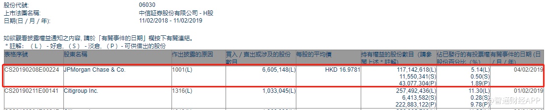智通财经APP获悉,根据联交所资料显示,摩根大通于2月4日增持中信证券(06030)660万股,每股作价16.9781港元,总值约1.12亿港元,最新持股数增至1.17亿股,最新持股比例增至5.14%。