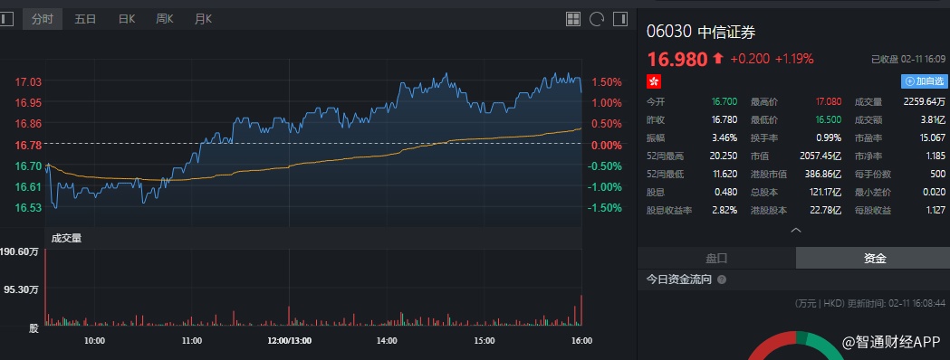 截至今日收盘,中信证券(06030)收涨1.19%,报16.98港元。