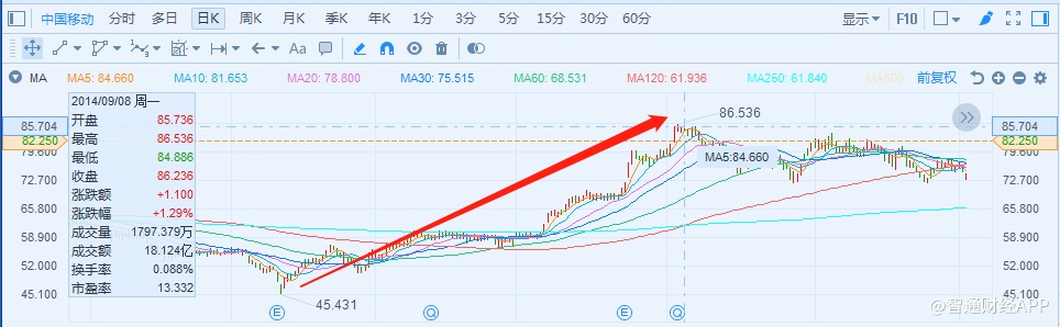 2013年12月4日,工业和信息化部正式向三大运营商发放了4G牌照。随后的2014年,见证了4G前期的阵痛和后期的爆发。也在这一年,中国移动股价上涨了21.32%。