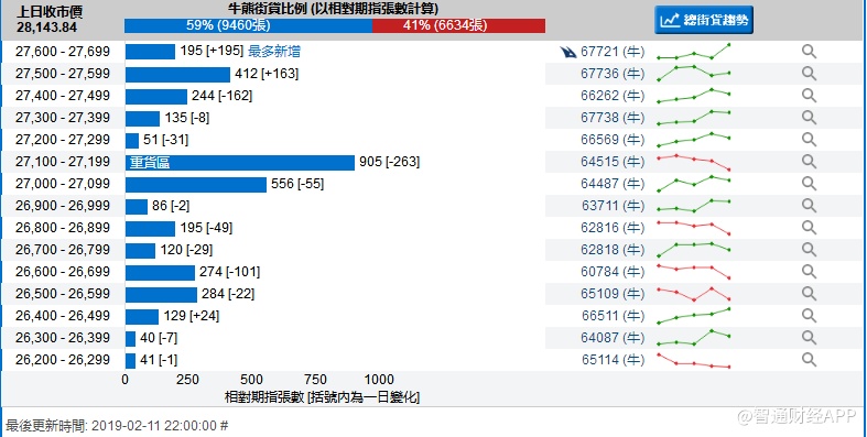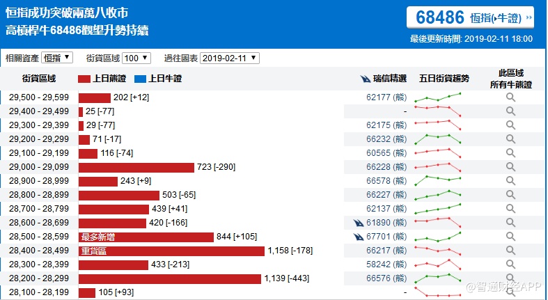 智通财经APP获悉,截至2月11日,恒指最新的牛熊街货比例59:41。从瑞信恒指牛熊证街货分布图中得到的数据显示,熊证街货重货区在28400-28499区间,该区间最新熊证数量为1158张,较上一交易日减少178张,最多新增区间为28500-28599,新增张数为105张。牛证街货重货区在27100-27199区间,该区间最新牛证数量为905张,比上一交易日减少263张,最多新增在27600-27699区间,新增张数195张。