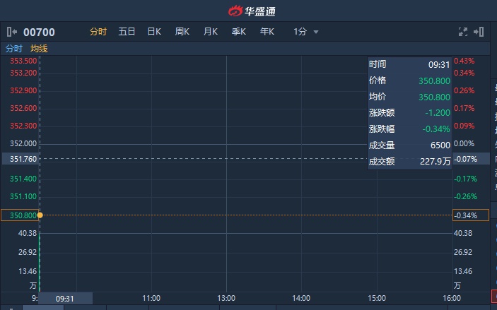 智通财经APP获悉,腾讯(00700)开市前有大2宗手成交,每股作价349.707元及352元,共涉及248.32万股,共涉资8.74亿元。股价低开0.34%,报350.8港元,成交额达10.43亿港元。