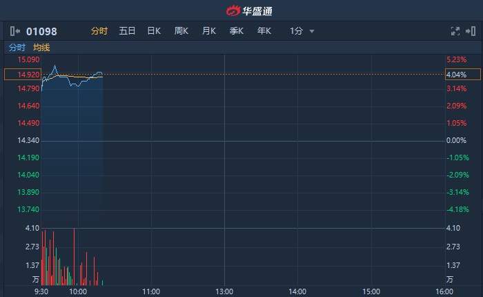 智通财经APP获悉,路劲(01098)今日跳空高开后高位震荡,截至10时19分,涨4.04%,报14.92港元,成交额达907万港元。