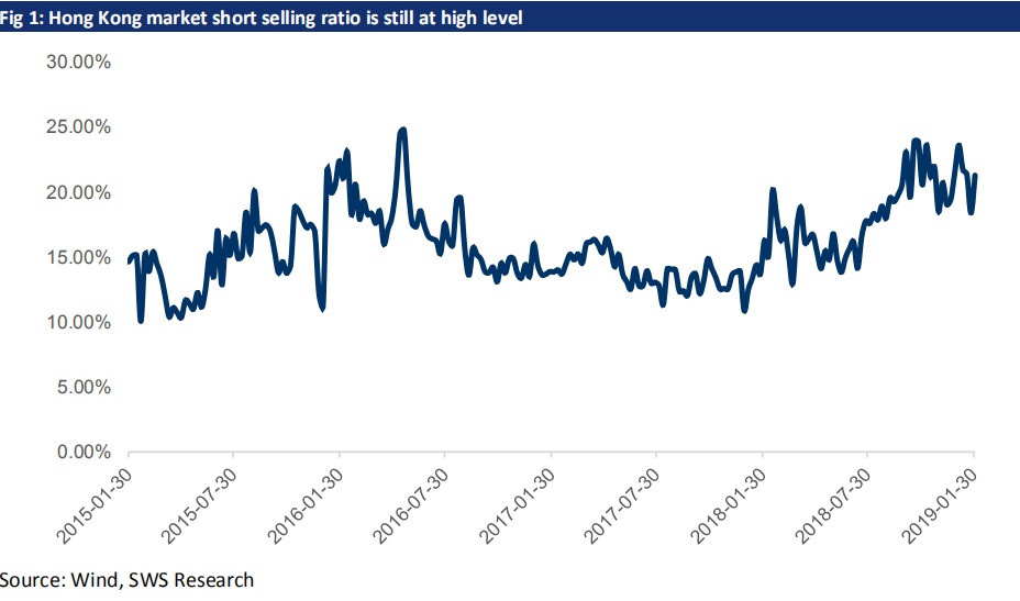 经济数据空窗期的风险偏好回升。在去年年底的时候,许多投资者对今年的中国经济持较为悲观的看法。然而,由于春节期间缺乏较为有效的数据,悲观的预期尚未完全得到实际数据的验证。另一方面,根据我们的宏观和银行业分析师的预测,部分金融数据,尤其是银行贷款和社会融资数据,在去年七月以来政府的各项宽松政策呵护下于今年年初可能会有较为明显的回升。与此同时,政府亦持续宣布了涵盖多个行业的经济刺激政策,我们预计市场的乐观情绪将会一直维持到三月全国人大的全国政协会议期间。而在美国方面,部分重要的经济数据,如 2018 年四季度 GDP 实际增速、PCE 核心通胀率等因美国政府部分关门而没有在最新一次的美联储 FOMC会议前发布。因此,美联储一方面传递出暂缓加息的信号,另一方面联储主席鲍威尔则提到将“保持耐心”及“等待并观察接下来的经济数据”。我们注意到港股的大市沽空比率在一月仍然维持在 21%左右,大大高于去年一月恒指高抽 10%时 13%左右的沽空比率,彰显出虽然过去一个月恒指反弹 8.11%,但投资者情绪仍然较为谨慎。