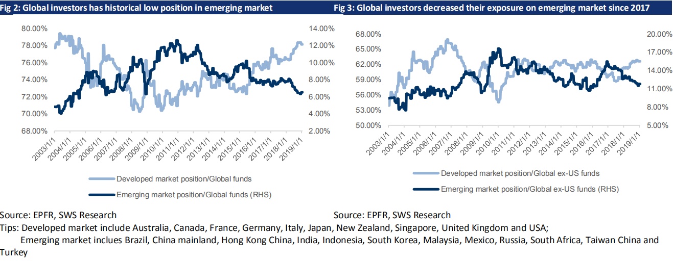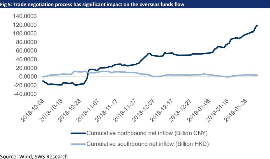 外资流入的趋势。在我们的 2019 年展望报告《只缘身在此山中:港股策略》中我们提到,在美联储可能放慢加息步伐和中美贸易争端出现好转的的情况下,海外投资者在 2019 年可能会重返新兴市场。此外,自 2013 年以来,新兴市场的估值水平就已大大落后于发达,尤其是美国市场。我们注意到全球配置型和全球(除美国)配置型从那时起均开始削减他们对新兴市场的配置比例,而最近这一比例已经接近十年以来的最低水平。此外,数家指数公司,如 MSCI 和Russell 等均可能将中国 A 股在其指数产品中的比重调升,这不仅将促使被动投资者,也将促进以其指数作为业绩基准的主动投资者在接下来数月中提升中国股票在其投资组合中的比重。我们预计指数成分股和大中盘股将更加受益于外资的流入。另一方面,我们注意到贸易谈判的进程对外资流入的节奏有着非常显著的影响。鉴于中美 90 天贸易谈判的最后期限即将到来,我们建议投资者密切关注外资的潜在波动和其对市场的影响。