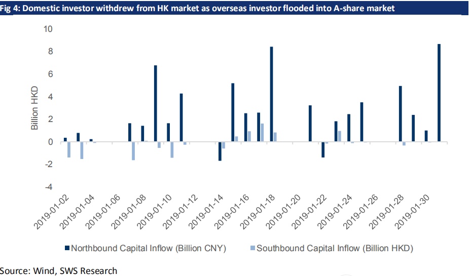 贸易摩擦、全球经济放缓和美联储加息周期是过去数月间对全球风险偏好有显著影响的三个因素。然而,在 2019 年的第一个月里,以上三个因素并没有继续恶化。伴随着全球风险偏好出现回升,全球股票市场在一月出现了明显反弹。对于二月,在海外资金流入的环境下我们预计港股市场的上升趋势仍然可以维持,但由于数项重大事件或会影响市场情绪以及疲弱的全球经济增长展望,市场的波动性或会上升。