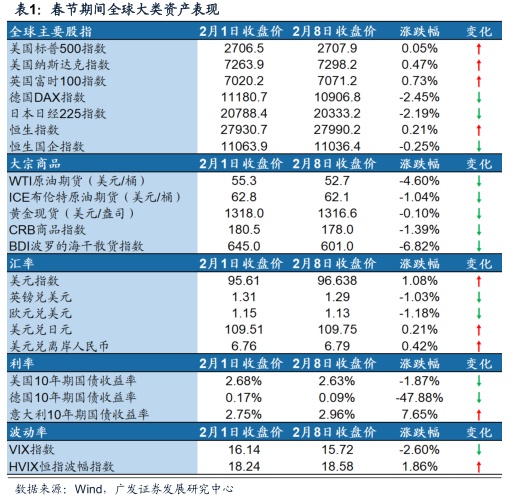 国内春节假期期间,海外大类资产表现各异。美股先跌后涨,前半周在乐观情绪和较好的美股业绩带动下上涨,而之后6个月、5年期美债收益率出现倒挂,加上市场担心中美贸易出现变数,引发市场波动。欧洲市场表现较为疲弱,欧盟委员会下调2019、2020年欧元区经济增速预期至1.3%、1.6%,此前18年11月的预期分别为1.9%、1.7%。对欧洲经济下滑的担忧导致欧元走弱,间接推升美元指数。