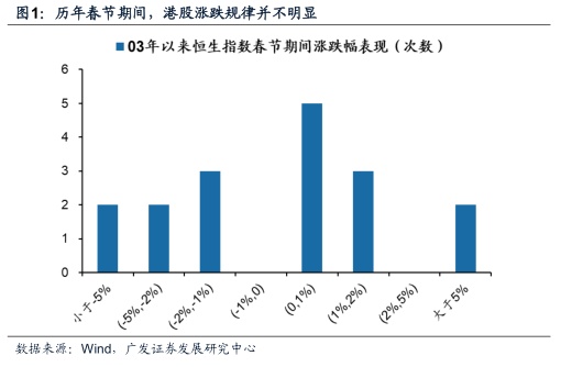 港股今年春节期间微涨,历年春节期间涨跌无规律。今年春节期间,港股共有1.5个交易日,恒生指数上涨0.06%。统计03年以来春节期间港股走势,港股在春节期间涨跌幅分布较为均匀,上涨次数略多于下跌次数,但并无显著规律。