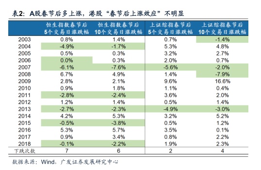 港股“春节后上涨效应”并不明显。03年以来,A股春节后短期内涨多跌少主要基于流动性和“两会”政策预期,但港股表现并无类似规律。