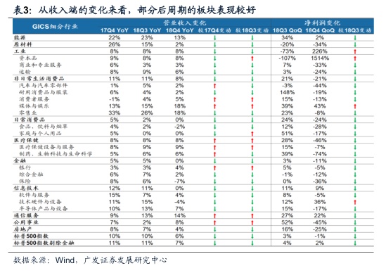 第一,从财报来看,美股18Q4的业绩表现的业绩表现较好,但市场对于19年EPS增长预期仍较为谨慎。以标普500成份中季报为10-12月的公司为样本,目前已有超过300家公司公布业绩,市值占比超80%,具有一定代表性。整体而言,标普500指数成份股业绩增长好于市场最悲观预期,且部分板块存在亮点,包括后周期行业(如消费者服务、媒体娱乐等)与防御属性较强的行业(如医疗保健、公用事业、通信服务等)。