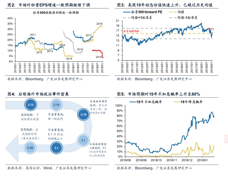 但较好的财报表现并未改变投资者对未来业绩增长的预期。由于企业资本开支、税改、两党分裂、中美贸易等面临的不确定性,市场对于2019年美股EPS预期仍在下修。随着2月中旬后大部分公司18Q4业绩公布完毕,18年较好的财报对美股的支撑力度在减弱,而19年逐渐增加的宏观压力使得美股基本面的压力增加。