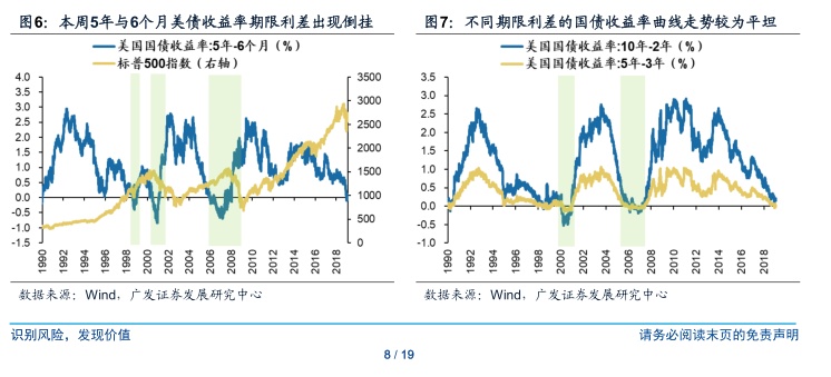 第四,美债收益率倒挂风险增加,避险情绪抬升。本周6个月、5年期美债收益率出现倒挂,与此同时5年-3年期、10年-2年期美债收益率趋平。历史上,期限利差倒挂后,美股回调风险增加,若未来期限利差倒挂持续,美股或重回高波动特征。