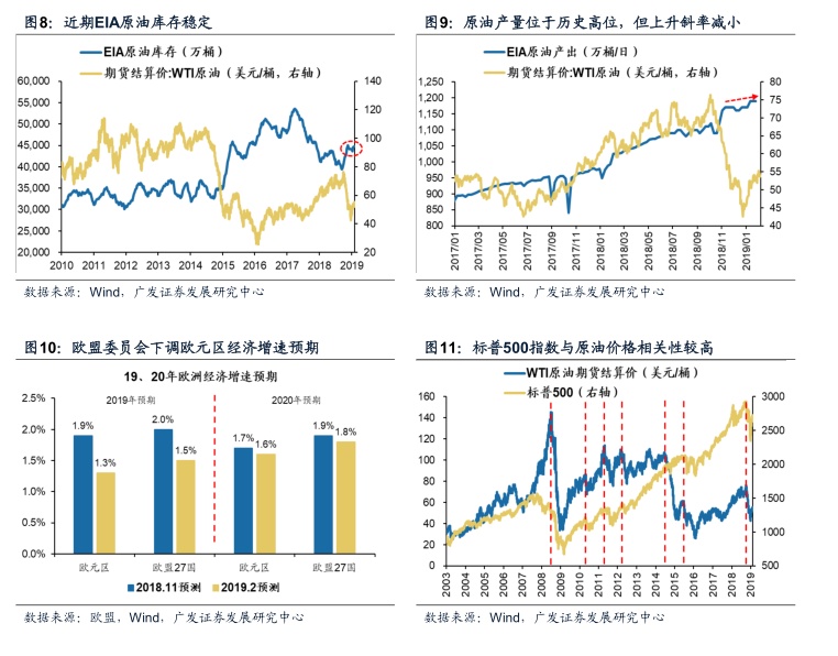 年初以来供给端较为稳定。年初以来,EIA原油库存先跌后涨,但整体较为稳定;从产出数据看,年初以来EIA原油产出增速相较于去年4季度已明显放缓。但需求端预期的放缓叠加,加剧了本周油价的下跌。近期欧盟委员会、英国、澳大利亚央行分别下调经济增速预期,以欧元区为例,欧盟委员会预期欧元区19年经济增速1.3%,大幅低于前预期值1.9%。市场对全球经济放缓的担忧加剧,增加了油价回调的压力。