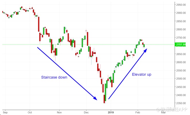 据智通财经APP了解,美国股市在2018年第四季度触底后便开始反弹并一路上扬至今,“爬着楼梯涨,坐着电梯跌”这句老话似乎是反了过来,股市现在的走势是“爬着楼梯跌,坐着电梯涨”。