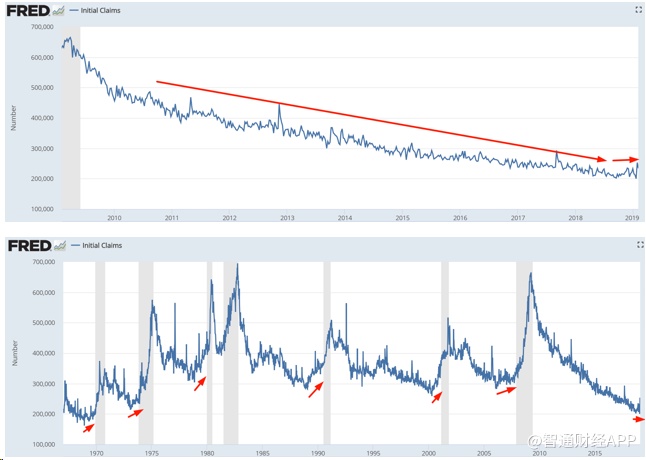 初次索赔数当前的3个月移动平均值高于其4个月前的水平,但持续低于25万人次,在市场上行周期的末段中经常都会出现这种情况: