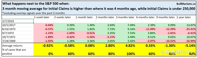 以下是标普500指数实现连续7周上涨且失业率低于5%时后市的走势:
