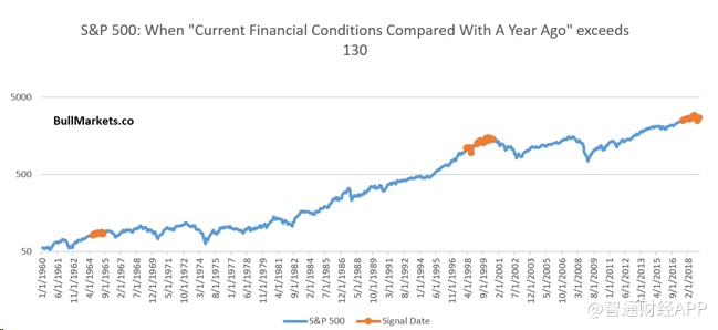 以下是“财务状况按年同比变化”指标值超过130的月份(橙色),该指标叠加在标普500指数上显示: