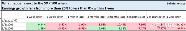 以下是盈利增长在1年内从20%以上下降0%以下后股市的走势: