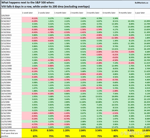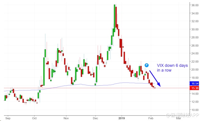 截至周三,波动率指数(VIX)已连续6天下跌,跌破200天均线: