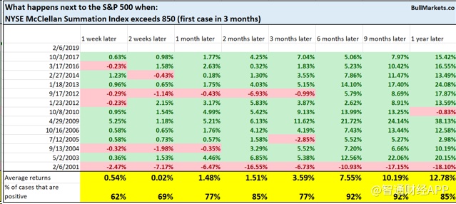 周三,纽交所麦克莱伦综合指数(NYSE McClellan Summation Index)也突破850点。这是一个非常强劲的信号,根据历史经验,此后的6-12个月内,股市将继续上涨: