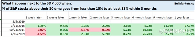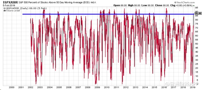 另一个衡量指标是股价超过50天均线的股票的比例,该指标在3个月内从不到10%飙升到88%以上: