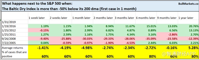 以下是当BDI指数低于200天均线的50%时,标普指数的后市走势: