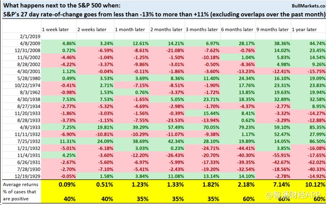 以下是标普500指数在200天均线之下实现连续7周上涨后股市的走势: