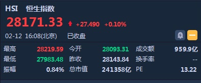 智通财经APP获悉,恒指早盘低开0.18%,报28093.31点。截至收盘,恒生指数涨27.49点或0.1%,报28171.33点,全日成交额达959.89亿。国企指数涨0.25%,报11044.65点,红筹指数涨0.25%,报4408.29点。