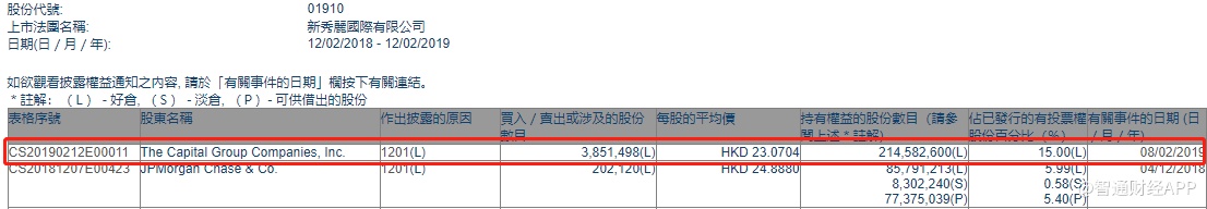 智通财经APP获悉,根据联交所资料显示,The Capital Group于2月8日减持新秀丽(01910)385万股,每股作价23.0704港元,总值约8882.10万港元,最新持股数减至2.15亿股,最新持股比例减至15.0%。