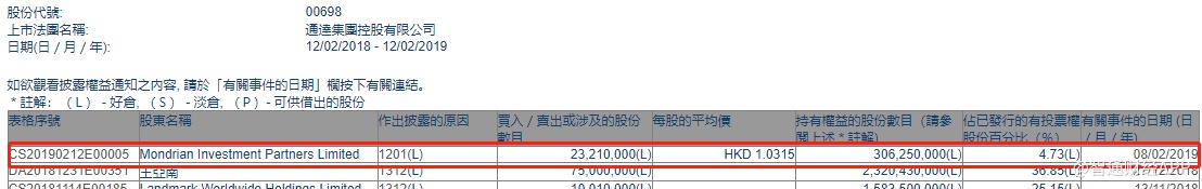 智通财经APP获悉,根据联交所资料显示,Mondrian Investment Partners Ltd于2月8日减持通达集团(00698)2321万股,每股作价1.0315港元,总值约2394.11万港元,最新持股数减至3.06亿股,最新持股比例减至4.73%。