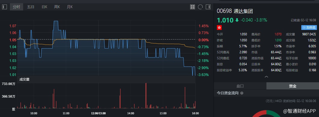 截至今日收盘,通达集团(00698)跌3.81%,报1.01港元。
