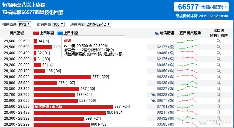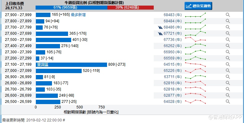 智通财经APP获悉,截至2月12日,恒指最新的牛熊街货比例61:39。从瑞信恒指牛熊证街货分布图中得到的数据显示,熊证街货重货区在28500-28599区间,该区间最新熊证数量为937张,较上一交易日增加24张,最多新增区间也在此区间。牛证街货重货区在27100-27199区间,该区间最新牛证数量为809张,比上一交易日减少273张,最多新增在27900-27999区间,新增张数165张。
