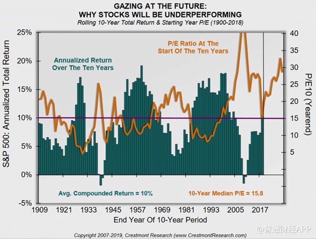 John使用了Ed Easterling of Crestmont Research截至2018年的市盈率数据,美股市场的价格高于平均市盈率。 以十年为一期并假设长期持有股票,当投资者以高于平均市盈率的买价进入市场时,回报率将低于平均水平。